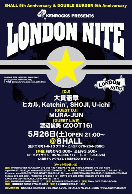 LONDON NITE IN 金沢 @8HALL 金沢市片町1−6−10 ブラザービル2F 当日¥3500 Katchin'さんDJスタートは、 22:30〜だそうです♪ 新曲も聞けちゃうかもですね!! ロンナイならではの色々なDJも 是非楽しんで下さい♪ そして渡辺俊美さんLIVEもあります♪