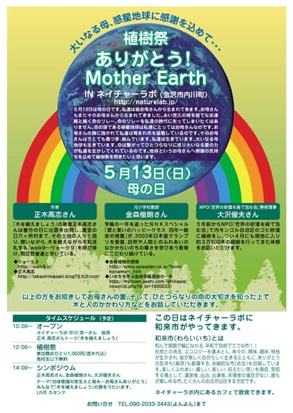 ***///***///***///***///***///***///***/// 5月13日(日)母の日 大いなる母、惑星地球に感謝を込めて・・植樹祭 『ありがとう!Mother Earth』 IN ネイチャーラボ (金沢市内川町) http://naturelab.jp/ (北國新聞社後援) ///***///***///***///***///***///***///*** 5月13日は母の日です。 私達は皆お母さんから生まれてきます。 お母さんもまたそのお母さんから生まれてきました。 永い悠久の時を経てなお連綿と続く命のリレー。 命のリレーを私達の時代に失ってしまい