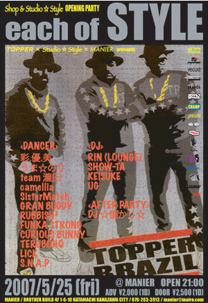 25日の金曜に久々に金沢でDJします! 是非遊びに来て下さい!! 『each of STYLE』Shop&Studio☆Style OPENING PARTY!! 協賛 TOPPER 2007/5/25 (fri) @MANIER OPEN/21:00 ADV/2,000YEN(1D) DOOR/2,500YEN(1D) <DJ> RIN SHOW-TA KEISUKE UG <DANCER> camellia Sister☆Match GRAN BUDDY RUBBISH3 FUNKA STRONG CURIOUS BUNNY TERUBOH LICK team 瀧田 うま☆のり S.N.A.P *チケット取扱店* VeGUAS / CHAMP / peace / EPOCHZ / CONNETICUT! / FAR SYDE / SKANDA / BG / MUSTACHE / Cr