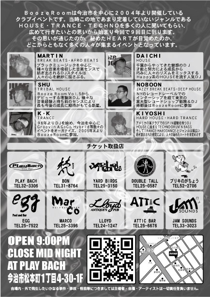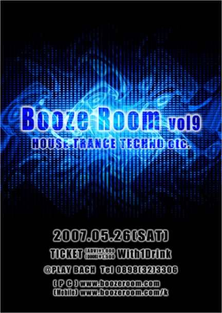Booze Room Staffが贈るDJイベントです。愛媛県の今治市を中心に活動をしており、当時この地であまり定着していないジャンルであるHouse.Trance.Technoを多くの人に聞いてもらい、広めて行きたい、という思いから始まりました。その思いが通じたのか、秘めたHeartが目覚めたのか、どこからともなく多くの人々が集まるイベントとなっています。House.Trance.TechnoをDJが次々とMIXする。音を楽しむ人、弾けたい人、出会いを求める人・・・なんでもいいから皆集まれ〜!!日常では感じられない非現実感覚を、あなたは知ることになる。