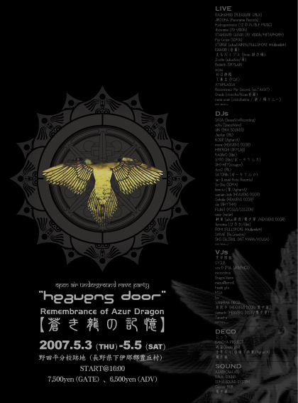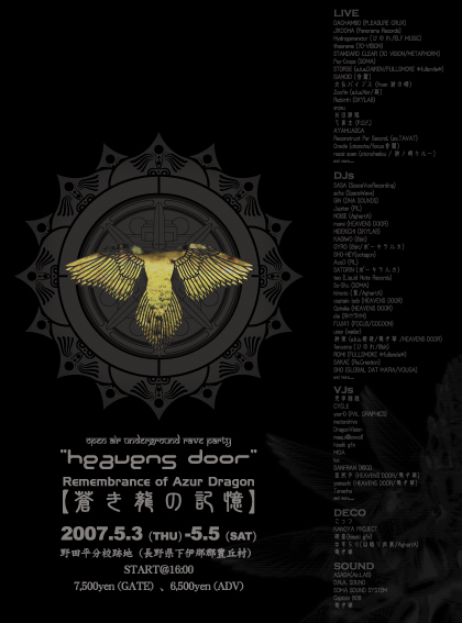 HEAVENS DOOR 9th "Remembrance of Azur Dragon【蒼き龍の記憶】" DATE:2007/05/03(THU)-05/05(SAT) GATE OPEN@12:00/START@16:00 ADMI:6500yen(adv:mail order),7500yen(gate) PARKING FEE:1500yen セーゴのマジカルバスツアー(限定DVD付き) 値段:7000yen (新宿 5/3 AM1:00発) PARTY VENUE:野田平分校跡地 (長野県下伊那郡豊丘村) ★ARTIST LINEUP★ LIVE------ DACHAMBO(pleasure crux)、JIKOOHA(Panorama Records)、Psy-Crops(SOMA)、STORGE(a.k.a.DAIKEN/FULLSMOKE *fullsmile*)、Hydrogenerator(HINOWA/