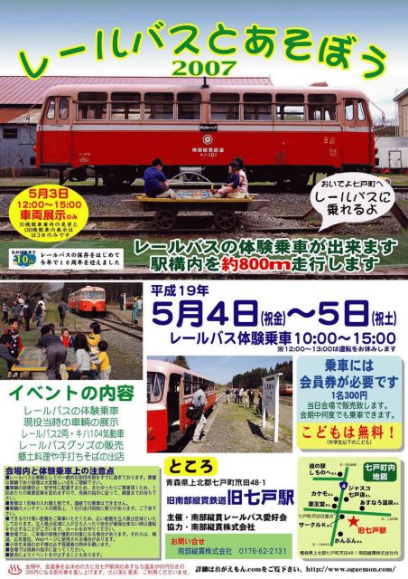 レールバスとあそぼう2007イベントの開催日が決定しました。 レールバスに体験乗車出来る日は 2007年5月4日〜5日の2日間です。 車両展示は2007年5月3日に開催されます。 詳しくはこちらをご覧ください。 http://www.ogaemon.com/r-bus/r-bus-top.html