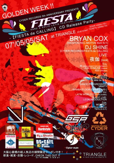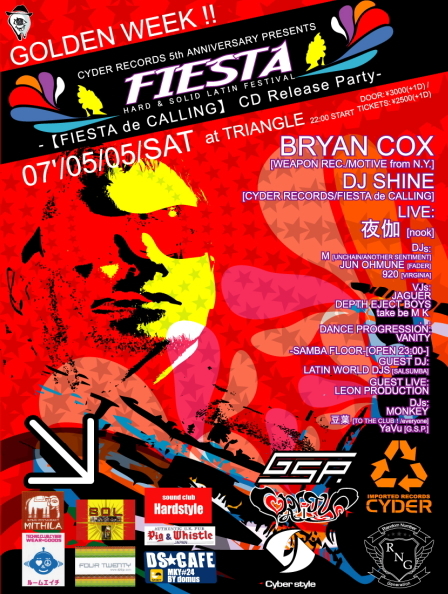 ☆CYDER RECORDS 5周年、そしてDJ SHINE MIX CD[FIESTA de CALLING]の発売を記念してのPARTYが本日開催!前回に引き続き、アメリカ・N.Y.に移り住んだばかりのBOUNCY HOUSE/TECHNOの雄:BRYAN COX:がお祝いに参戦!2007年5月5日SAT、この日ばかりはこどもに立ちかえり、存分にこの神聖なるLATINNIGHTに身を委ねよう。世界で一番熱い一夜を約束する。