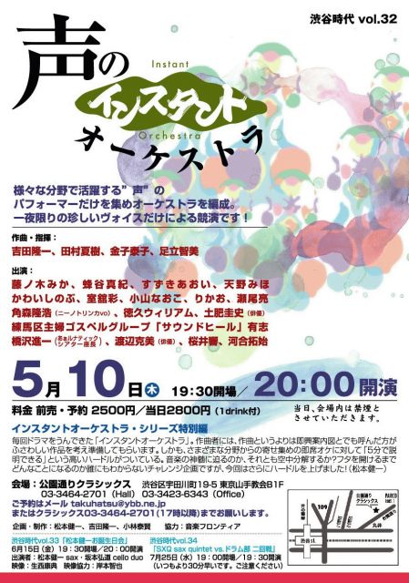 渋谷時代vol.32 声のインスタントオーケストラ 作曲・指揮: 吉田隆一、田村夏樹、金子泰子、足立智美 出演者: 藤ノ木みか、蜂谷真紀、すずきあおい、天野みほ、かわいしのぶ、室舘彩、小山なおこ、りかお 瀬尾亮、桜井響、角森隆浩(ニーノトリンカvo)、徳久ウィリアム、土肥圭史(俳優) 練馬区主婦ゴスペルグループ「サウンドヒール」有志 橋沢進一(あぁルナティックシアター座長)渡辺克美(俳優)、河合拓始 企画・制作:松本健一、吉田隆一、小林泰賢 協力:音楽フロンティア 19:30開場 / 20:00開演   料金 前売