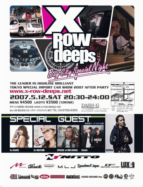 X-row-deepsとは、2007.5.12(土曜日)にDASH-Gで開催されるクラブイベントです。X-row-deepsは東京ビックサイトで5/11〜13に開催されている日本唯一の輸入車カスタム・チューニングカーショー『SIS東京スペシャルインポートカーショー2007』のOFFICIAL AFTER PARTYとして企画されました。是非 車好きの人は昼間はSIS東京スペシャルインポートカーショーで最新のカスタムがされた輸入車を、、そして夜はX-row-deepsで楽しんで下さい。
