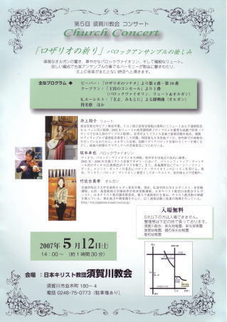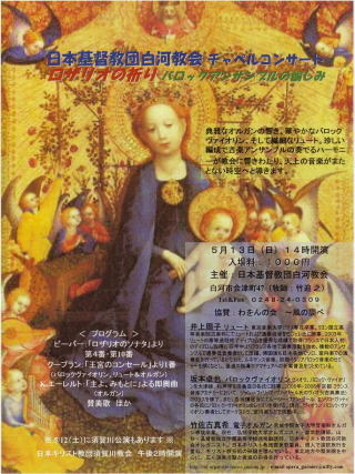 こんにちは。 5月にありますコンサートのご案内です♪ バロックアンサンブルがメインですが、オルガンソロはロマン派の曲も演奏します。 福島近郊の方、よろしかったらぜひお出かけくださいませ。 ■須賀川公演 5/12(土)午後2時〜 入場無料 主催:日本キリスト教団須賀川教会 ■白河公演 5/13(日)午後2時〜 有料1000円 主催:日本キリスト教団白河教会 ※電子オルガン使用 バロックヴァイオリン:坂本卓也 http://sakamochi.jp/ リュート:井上周子 http://www.geocities.jp/reomiyaz/chikakohp/index.html