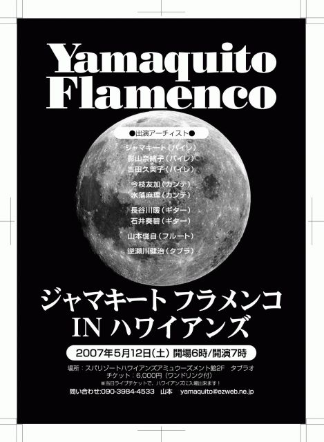 東京駅より無料送迎バス、ライブチケット ア−ティストと打ち上げ、シングルル−ム 朝食、ハワイアンズ入場券2日分 料金20000円のツア−です 問い合わせ 090−3984−4533(山本) yamaquito@ezweb.ne.jp 出演者 バイレ(踊り) ジャマキ−ト 影山奈緒子 吉田久美子 カンテ(唄) 今枝友加 水落麻理 ギタ− 長谷川暖 石井奏碧 フル−ト 山本俊自 タブラ 逆瀬川健治