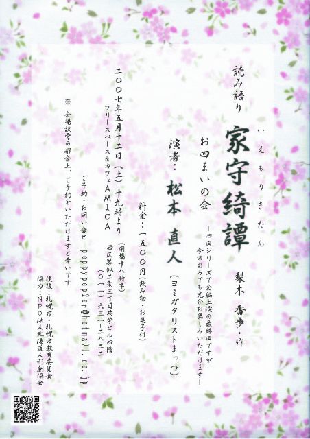 文字で読んだものが、心に聞こえて響いてくる気がする。 人の声が語ったら、どんな言葉が見えてくるんだろう… *:・゚'★,。・:*:・゚'☆,。・:*:・゚'★,。・:*:・゚'☆,。・:*:・゚'★,。・:* 【 読み語り 家守綺譚 お四まいの会 】 演者:松本直人(ヨミガタリストまっつ) 日時:5月12日(土)19時開演(18時30分開場) 場所:フリースペース&カフェAMICA (札幌市西区琴似2条3丁目共栄ビル4階) 料金:1500円(飲み物・お菓子付) 一・二・三の会にご来場の方は