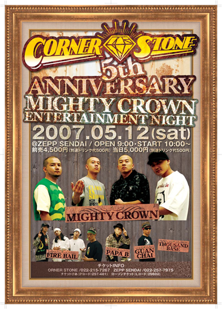 ■2007.5.12(Sat) @仙台 "CORNERSTONE 5th ANNIVERSARY MIGHTY CROWN ENTERTAINMENT NIGHT" -----MIGHTY CROWN------ -FIRE BALL--PAPA B--GUAN CHAI- <OPEN/START>21:30 / 22:00 <TICKET INFO> CORNER STONE 022-215-7267 ZEPP SENDAI 022-257-7975 <出演> MIGHTY CROWN with SOUND SYSTEM / FIRE BALL / PAPA B / GUAN CHAI