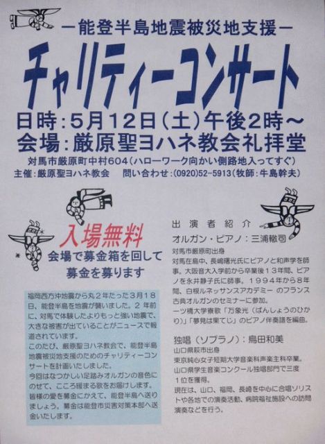 能登半島地震被災地支援チャリティーコンサートを行います。 日時:5月12日(土)午後2時〜 会場:厳原聖ヨハネ教会礼拝堂 厳原町中村604 ハローワーク向かい路地入ってすぐです。 出演:三浦轍司 オルガン・ピアノ 烏田和美 ソプラノ 懐かしい足踏みオルガンで癒しのひとときをお過ごしいただきたいと思います。 主催:厳原聖ヨハネ教会 問い合わせ 0920−52−5913 牧師:牛島幹夫 入場無料ですが、会場で募金を集めます。 当日集めた募金は、輪島市災害対策本部に送金します。 (輪島市と書く