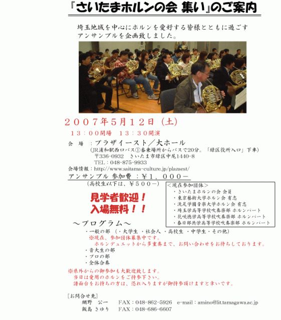 5/12 埼玉県さいたま市にある、プラザイースト/大ホール にてアンサンブルのイベントを行ないます。 詳細は写真を見て頂ければすぐにおわかりになるかと思い ますが、多団体のアンサンブルを予定しております。 (藝大・洗足大学・埼玉栄高校・・・etc) もし興味がありましたら楽器を持参の上、ご参加下さい。 (全体合奏も御座いますので) 宜しくお願い致します。