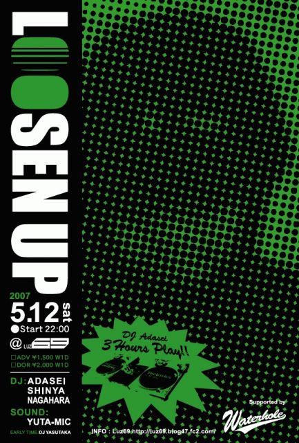 LOOSEN UP SP (Supported by Waterhole) [HIPHOP/R&B] 『DJ-ADASEI 3HOURS PLAY』 ■DJ ADASEI SHINYA NAGAHARA ■SOUND YUTA-MIC [EARLY TIME DJ] YASUTAKA 今回の目玉はDJ-ADASEIの3HOURS PLAY!!! 普段のPLAYとは一味違ったPLAYを披露するとの強気発言!!!!! 3HOURSの中で流れ作ってキッチリあげるとの事 これは見逃せません!!!!! そして69で毎月第4金曜日のR&B PARTY 『SOUL STREAM』 のDJ-SHINYA そして69初PLAYの DJ-NAGAHARA REGGAE SOUNDは YUTA-MIC 独りでどう頑張るのか??? 見物