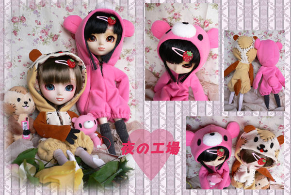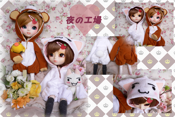今回スペース初めてお借りします。 プーリップ用に製作した、着ぐるみになります。 2ndボディを元に型紙をおこしましたが、つなぎ型になりますので 1・3ボディでもご利用頂けます。 それぞれ一点ものになりますので、お譲りする方が決まり次第終了させて頂きます。 **セット内容** ★着ぐるみ★いちごのピン 以上2点セット (お人形、その他付属品は含まれません) **着ぐるみの種類** ?グルーミー風 ?トロ風 ?リラックマ風 ?マングース風 以上、4種類。 [金額] それぞれ1セット3000円(送料込み