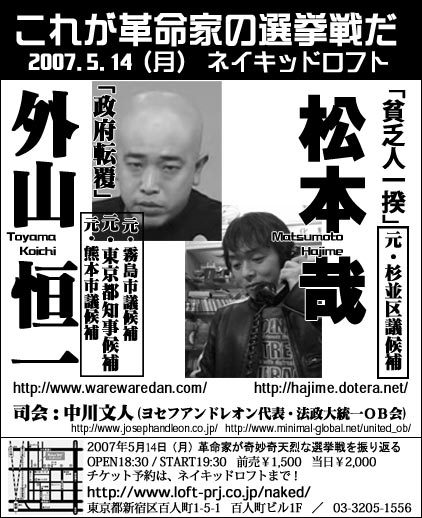 なんだかよくわからないうちに、今度、あの都知事候補・外山恒一とイベントをやることになった! しかも、当日、外山門下生が大量に動員される可能性大! おい、ファシストが集まる!これはキケンだ!! 貧乏人・大バカ者・役立たず・ヒマ人諸君! 外山軍団に対抗できるのは諸君しかいない!! 14日は新宿に駆けつけるしかない!!! 5月14日(月) OPEN 18:30 START 19:30 新宿・ネイキッドロフト 前売1500円(米が5kg買える) 当日2000円(牛丼を約7杯食える)