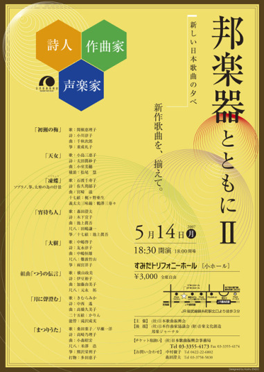 「邦楽器とともにII〜新しい日本歌曲の夕べ〜新作歌曲を揃えて」 日時:2007/05/14(月) 18:30開演(18:00開場) 場所:すみだトリフォニー小ホール (JR総武線・地下鉄半蔵門駅「錦糸町」駅下車、歩3分) 料金:3000円 出演 石渡千寿子・きむらみか・桑田葉子・小島三恵子・関根恵理子・中嶋啓子・早瀬一洋・森田澄夫・横山政美(以上、歌) 滝沢成実・田嶋謙一・難波竹山・松尾慧・元永拓・米澤浩(以上、笛・尺) 雨宮洋子・梶ヶ野亜生・かりん・熊沢栄利子・重成礼子・池上眞吾(以上、箏・十七絃・二十五絃) 鶴澤三寿々(義太夫三味線)、