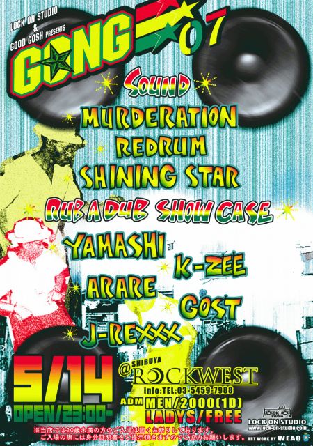 5月14日 LOCK ON STUDIO & GOOD GOSH PRESENTS ~GONG'07~ DANCEHALL 2nd MONDAY @渋谷ROCKWEST TEL:03-5459-7988 ADM: MEN/\2000(1D) LADYS/FREE OPEN/23:00- ※SPECIAL PRICE、女性の方は入場無料!! ※要IDチェック MORE INFO:www.lock-on-studio.com 5/14 -SOUND- MURDERATION REDRUM SHINING STAR -RUB A DUB SHOW CASE- YAMASHI K-ZEE ARARE GOST J-REXXX 【ROCK WEST:渋谷東急ハンズ向かい(坂道側)ハーレーダビットソンの入ってるビル7F】