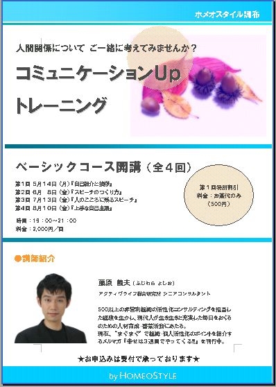 はじめましてヨッシーといいます。 先ほど、コミュニティーに入ったばかりです。 いつもは、調布ハウスに行っています。 男性ですが、縁あって、ホメオスタイルにいくことに なりました。 どうぞ、よろしくお願いします。 さて、実は、紆余曲折あって、 調布ハウスでセミナーをすることになりました。 内面美を高める内容です。 タイトルは、 「コミュニケーションUPトレーニング」 女性は論理的な会話ができるようになり、 男性は会話のキャッチボールができるようになります。 このセミナーの目的は、3つ。 1.日