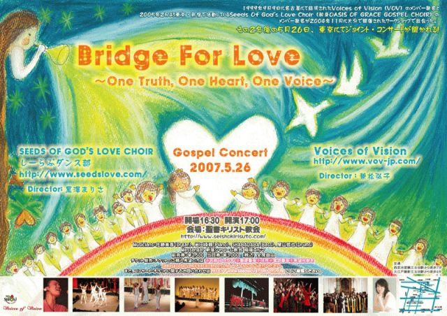 名古屋と東京という別々の土地に活動拠点を置く ふたつのクワイアがひとつのクワイアとなって コンサートを開きます! BridgeForLove〜OneTruth,OneHeat,OneVoice〜 1999年9月9日に名古屋にて結成された Voices of Vision(VOV)のメンバー数名と 2005年2月より東京・新宿で活動している Seeds of God's Love Choir(前身OASIS OF GRACE GOSPEL CHOIR)の メンバー数名が2004年11月に大分で開催されたワークショップで出会った。 その2年後の5月26日、東京にてJoitConcertが開かれる! http://www.seedslove.com/bfl.html