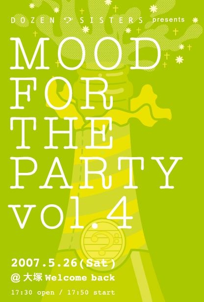 2007年5月26日(土) 〜DOZEN? SISTERS presents〜 MOOD FOR THE PARTY vol.4 場所:大塚Welcome back (http://www.welcomeback.jp/) 東京都豊島区南大塚3-44-11 フサカビルB1 Phone & Fax : 03-5957-5141 時間:17:30 open / 17:50 start 料金: 1,500円+ドリンク代500円 出演:DOZEN? SISTERS (GLOM / まあち / Love・G) Em's Note ivory verrys Quest of True Note The Belles & The I.N.K. * * * * * お待たせいたしま