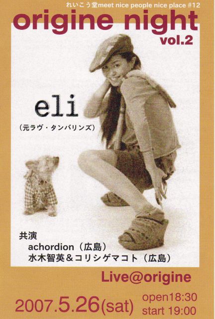 スペシャル2DAYS!! スペシャルゲスト eli(ex.Love Tambourines)from 東京 れいこう堂、信恵さんの言葉 「あのeliさんが歌いにきてくれます! 信じられますか?すごいことです!!」 <れいこう堂コミュ> http://mixi.jp/view_community.pl?id=156341 <Live in 広島 > れいこう堂meet nice people nice place #12 origine night vol.2 ●開催日:2007.5.26(土) ●会場:origine http://www.origine.jp http://mixi.jp/view_community.pl?id=1970566 広島県広島市中区富士見町1-5 082-246-9949 ●時間: