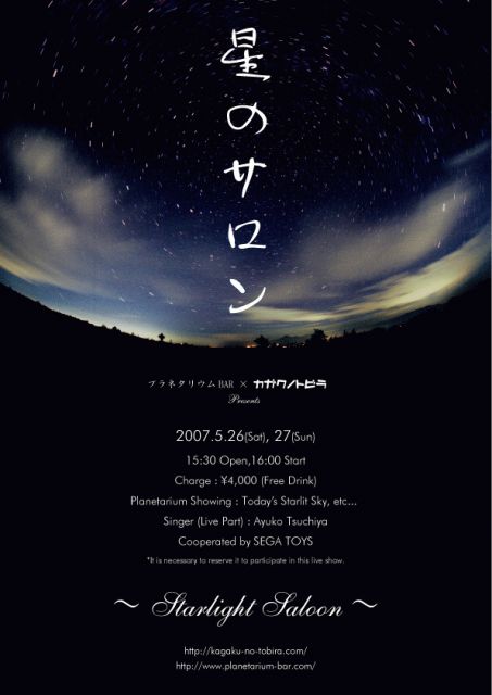 プラネタリウムBARコミュのみなさん、こんにちは。 私、カガクノトビラプロジェクトという星もの系の コンテンツを提供してるWEBサイトを運営している ブラボーKことコバヤシと申します。 この度プラネタリウムBARさんとのコラボレーション ということで、イベントを企画いたしました。 詳細は下記ご参照下さいませ。 プラネタリウムBARに興味はあって行きたいけれど、 なかなかキッカケがなくって、とお考えの方なども ぜひご利用くださいね。 もちろんお一人様でも大歓迎です! お申込は5月1日からとなります。 席数に限りがござい