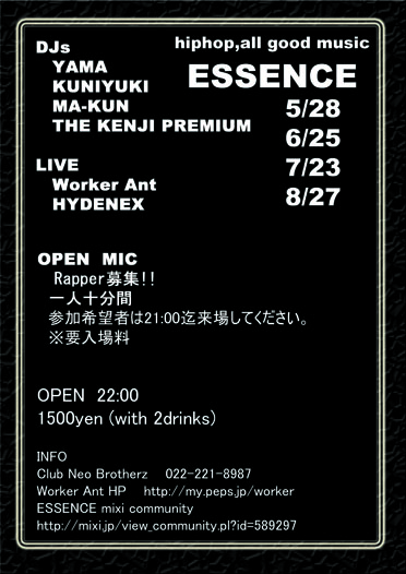 ESSENCE vol.5 \1500(w/2d) Club Neo Brotherz Dj Yama (Worker Ant) Kuniyuki (Worker Ant) THE KENJI PREMIUM (HYDENEX) Ma-kun LIVE Worker Ant HYDENEX 今回はHYDENEXも全員集合。 Dj Ma-kun come back!!! そして、3月、4月に物販を騒がせた アノ男の超問題作の 第二弾、早くも登場です。 22:00 Open ※Rapper朗報! 自分の楽曲を披露したい方は 当日21:00までにClub Neo Brotherzまで来て頂ければ LIVE時間を設けますので この機会に是非! 詳しいことは nyokk_da_skunk@hotmail.co.jp