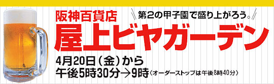 さぁ、ビールの美味しい季節がやってまいりました。 ビール大好き♪ タイガース大好き♪ 騒ぐの大好き♪ みんな集まれ〜♪ 阪神百貨店の屋上ビヤガーデンにて、 130インチ大画面にて阪神タイガースを応援しよう! http://www.hanshin-dept.jp/dept/s_beergarden_index.html?page=3#seat_info 【日 時】2007年6月2日(土)17時30分より 【場 所】大阪梅田の阪神百貨店屋上ビヤガーデン 『阪神のスカイバイキング』 【予 算】3,400円(食べ放題、飲み放題) この日は札幌ドームにて、 日ハム 対 阪神タ