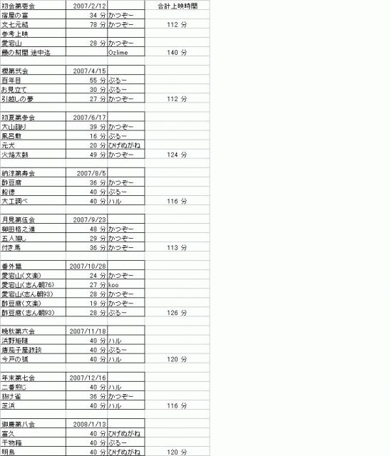 「志ん朝さんの落語を見たい人たちの会」「志ん朝いごくを観るの会」に続く第3弾のイベントです。 わたしは「こづかい」役のかつぞーです。元々の仕掛人は、ゆきばば姐さんです。 志ん朝師匠の落語は市販ビデオが出ていませんが、その高座のお姿をひとめ見たいという願いを叶えるべく、手持ちの映像を持ち寄ってご一緒に鑑賞するという趣旨の会として第一回目21名、第二回目26名の方々にお集まり戴きました。今回は、その三回目になります。 見ること自体は無償、コピーのやりとりは無し、会場は私的利用の範疇に収まる閉じた環境、会場の経費