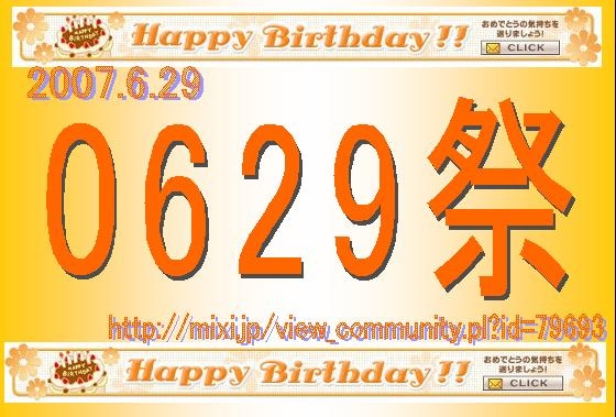 こりもせず またまたやってきますよ! 0629! 一年に一回しか来ませんよ! というわけで 今年で三回目! 初めての方も そうでない方も やっぱり みんなで 祝おうじゃないか! とかそういう趣旨なのです ようするにいっぱいめでたいぜ てなあれですよ □□□□□□□■■□□□□□□□□□□□ いままでしたような 行動 □□□□□□□■■□□□□□□□□□□□ 1 メンバー各位に足跡つけたおしたり 可能な限り書き込みとか(又はメッセージ)をする 2 自分のトップ画像を 誕生日っぽい奴に変える