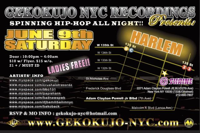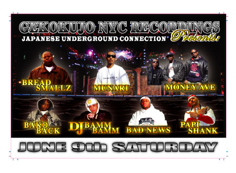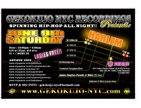 遂に今週の6月9日(土曜日)に、Gekokujo nyc Recordings Party が開かれます。 Undergroundながらもスキルを十分に持ったラッパーにDJ達のパーティー。しかも、今回はLADIES FREE!!来週の土曜はパーティーに是非!