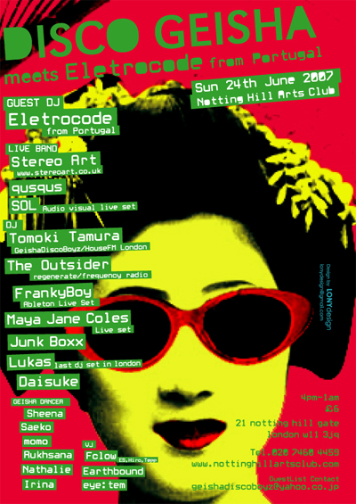 今回もビックGuestが登場。ポルトガルから最近ではxpress2のリミックスも大絶賛なEletrocodeが登場、ロンドン初ではないでしょうか。もう既にNottingHillArtsClubの看板party的存在の芸者Disco。