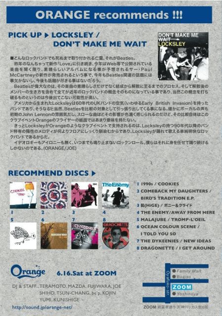 ³èư9ǯÌÜ¤ËÆÍÆþ¤ÎOrange¡ù¡ù ¤¤¤Þ¤Þ¤Ç°Ê¾å¤ËËè·î¡¢ÁÇŨ¤ÊÌë¤ò¤ß¤Ê¤µ¤ó¤È²á¤´¤»¤ë¤è¤¦¤Ë¤¬¤ó¤Ð¤ê¤¿¤¤¤È»×¤¤¤Þ¤¹¡£ 6·î¤ÎOrange¤Ï¡¢µ×¡¹¤ËÆÃ½¸¤Ê¤·¡¢¥²¥¹¥È¤Ê¤·¤Î¡¢¥·¥ó¥×¥ë¤Ê¥¹¥¿¥¤¥ë¤Ç¤´¤¶¤¤¤Þ¤¹¡£Orange DJs¥ª¥¹¥¹¥á¤ÎºÇ¿·¥Ò¥Ã¥Ä¤òɮƬ¤Ë¡¢¥¤¥«¤·¤¿¥Ê¥ó¥Ð¡¼¤Î¿ô¡¹¤Ç¡¢Ä«¤Þ¤ÇÍ٤궸¤¤¤Þ¤·¤ç¡¼¡£ ¡ùOrange¡ù 6.16.Sat ...at CLUB ZOOM (Ê¡²¬¿ÆÉÙ¹§Ä̤ê) (1500yen <with 1drink & compiled CD,> open/start 21:00 DJ&STAFF¡Ä TERAMOTO, MAZDA, FUJIWARA, JOE, SHIHO, TSUN-CHANG, be'p, KOJIN, YUMI, KUNISHIGE