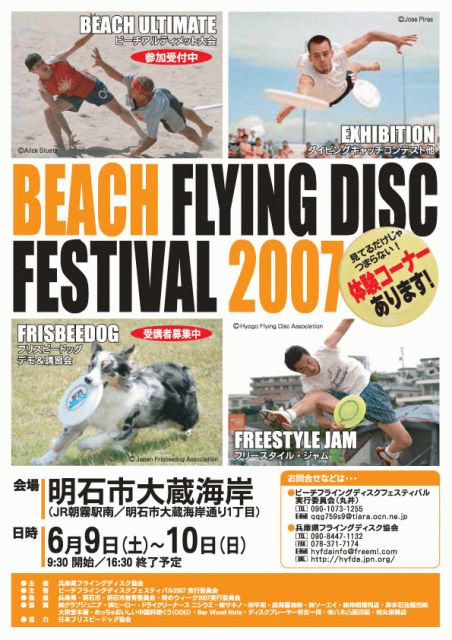 開始:9時30分 終了:16時30分 〜浮遊感@明石〜 明石海峡と明石大橋を背景に、 フライングディスクの様々な種目が楽しめるイベントです。 砂浜でビーチアルティメット、海岸沿いの原っぱでフリースタイル!! その他にもフリスビードッグやダイビングキャッチなどなど、代々木とは違う風がふきます。 対象:楽しもうとする人。 ディスク素人〜熟達者。 たまたま通りかかった人。 入場:自由。 会場と言っても、海岸なので柵やフェンスなどはなく どなたでも立ち寄れ