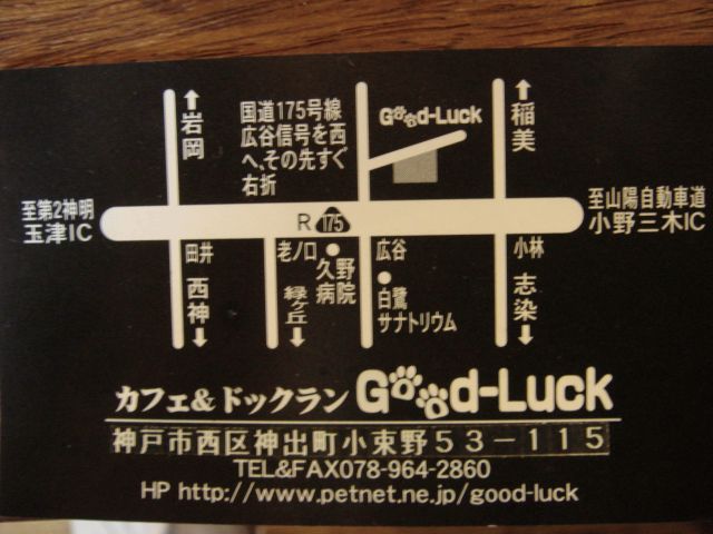 カフェ&ドッグラン『GOODーLUCK』 ※HPは今、見れません。 カフェは今はやってないのでドッグランにて開催します。 外でやるので雨天中止です。 フリマもここでやる予定でしたが、須磨区のリラックスに場所を変更します。 詳しくは→http://mixi.jp/view_event.pl?id=18411796&comm_id=1132829 参加費用はドッグラン使用料500円(1匹増えるごとに100円追加) 食事、飲み物は各自用意して下さい。 お車で来られる場合は、第二神明玉津ICを北上 又は、山陽道三木小野IC南下して下さい。 電車で来ら