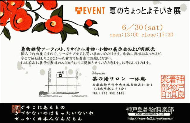 お待たせいたしました!! 『神戸良着物倶楽部』恒例の夏のよそいき展を開催いたします☆ ━━━━━━━━━━━━━━━━━━━━━━━━━ ■07’夏のちょっとよそいき展■ ━━━━━━━━━━━━━━━━━━━━━━━━━ 日時 : 平成19年6月30日(土)13:00〜17:30 場所 : 元町 ”茶の湯サロン 一休庵” 兵庫県神戸市中央区北長狭通3-10-1 (JR/阪神元町駅より5分) 地図はこちら↓ http://map.yahoo.co.jp/print?nl=34.41.19.20&el=135.11.28.42&memo=%c3%e3%a4%ce%c5%f2%a5%b5%a5%ed%