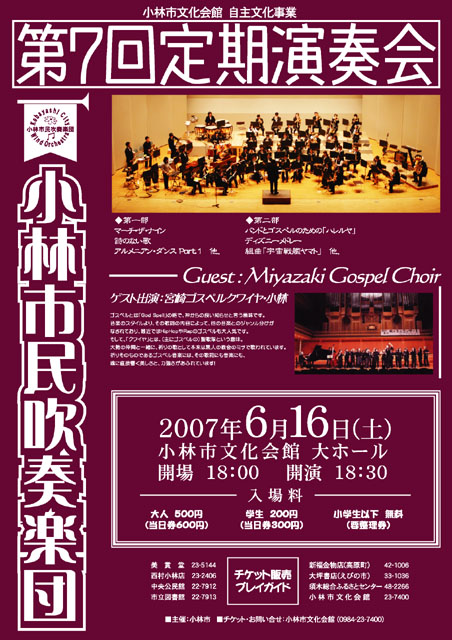 みなさんこんにちは。 演奏会のお知らせです。 小林市民吹奏楽団 第7回定期演奏会 期日 2007年6月16日 開場 18:00 開演 18:30 場所 小林市文化会館 大ホール 入場料 大人 500円(当日600円) 学生(中・高校生) 200円(当日300円) ※小学生以下無料(要整理券) ◆第一部 マーチ・ザ・ナイン 詩のない歌 アルメニアン・ダンス Part.1 他. ◆第二部 バンドとゴスペルのための「ハレルヤ」 ディズニーメドレー 組曲「宇宙戦艦ヤマト」 他. 今年は第2部に「宮崎ゴスペルクワイヤ・小林」さんをゲス