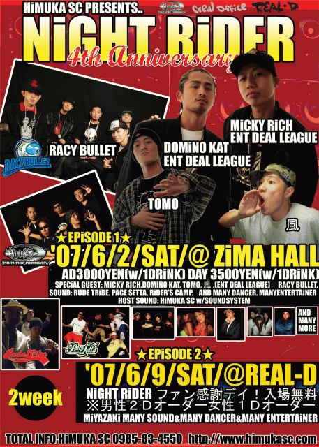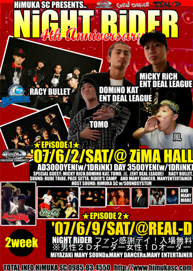 今週土曜日は宮崎でおなじみナイトライダーの4周年記念イベント!今年は2週間連続でやっちゃいます!!! ◎スペシャルゲストに去年GOD BLESSにも出演し、現在飛ぶ鳥を落とす勢いのRACY BULLET軍団よりENT DEAL LEAGUE(MiCKY RiCH. DOMiNO KAT. TOMO. 風)そしてサウンドにRACY BULLET!!!!!!! ■NiGHT RiDER 4th Anniversary (episode.1) ●6月2日土曜日 PM9:00START ●ADM3000YEN(W/1DRiNK) DAY35OOYEN(w/1DRiNK) ●@ZiMA HALL ★SPECiAL GUEST★ MiCKY RiCH (ENT DEAL LEAGUE) DOMiNO KAT (ENT DEAL LEAGUE)