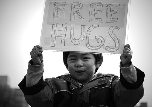 今世界中で広がっている「フリーハグキャンペーン」をご存知ですか?日本語にすれば、Free Hug=無償での抱擁。 始まりは、オーストラリアで一人の男性が始めたシンプルなアクションでした。ロンドンから帰国したときに、母国の人が寂しそうな顔をしていると感じた彼は、「人を笑顔にするのは難しい。でもハグをすればみんな笑顔になる」と思い、少しでも勇気づけたいとの想いからFree Hugsの看板を掲げ街に出たのです。そのときの映像↓ http://www.youtube.com/watch?v=vr3x_RRJdd4 インターネット上でこの映像が見れるようになって、「フ