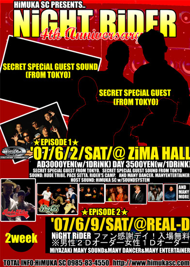 おなじみナイトライダーの4周年記念イベント! 今年は2週間連続でやっちゃいます!!! ■NiGHT RiDER 4th Anniversary (episode.1) ●6月2日土曜日 PM9:00START ●ADM3000YEN(W/1DRiNK) DAY35OOYEN(w/1DRiNK) ●@ZiMA HALL 出演:シークレットスペシャルゲスト シークレットスペシャルゲストサウンド SOUND: RUDE TRiBE. PACE SETTA. RiDER'S CAMP. ANDMORE... ENTETAiNER: ただいまブッキング中 DANCER: ただいまブッキング中 HOST SOUND: HiMUKA SC w/SOUNDSYSTEM シークレットゲストについては、5月25日、