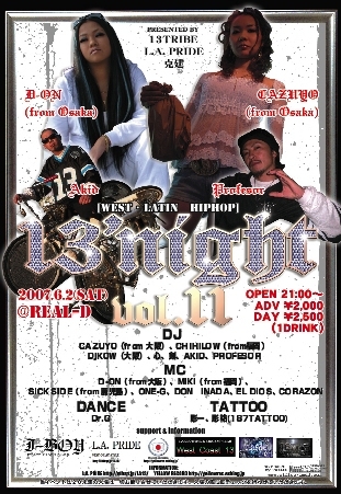 2007.6.2(土) PM9:00〜 13TRIBE・L.A. PRIDE・克建 PRESENTS 13'NIGHT Vol.11 宮崎@REAL-D [WEST・LATIN HIPHOP] DJ :CAZUYO(from 大阪)、CHIHILOW(from福岡) DjKOW(大阪)、 心、剣、AKID、PROFESOR MC :MIKI(from福岡)、 SICK SIDE(from 鹿児島)、 ONE−G、DON INADA、EL DIOS、CORAZON DANCE:Dr,G TATTOO: 彫一、彫祐 □時21:00〜 □料前売2000円,当日2500円(1drink) 当日、6/9リリースになるLatina Mix"BO