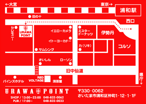 当コミュもおかげさまで二周年。 久々の飲み会をしたいと思います。 ★1次会 【場所】URAWA POINT(浦和) 【TEL】048-832-0033 【HP】http://www.urawapoint.com/ 【時間】6時半開始予定 【予算】4000円(飲み放題付き) ★2次会 【場所】 串焼き亭 ねぎ 【時間】 21時 〜 【住所】 浦和区仲町2−1−2 旧中山道をユザワヤさんから大宮方面へ徒歩約2分。門前通り沿い。 【電話】048-832-4422
