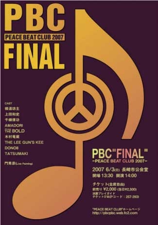 PEACE BEAT CLUB 2007 FINAL 2007年6月3日(日)長崎市公会堂 開場/開演 13:30/14:00 ● 横道坊主 ● 上田和史 ● 千綿 偉功 ● AMADORI ● THE BOLD 〜 Of once ● 木村竜蔵 ● THE LEE GUN'S KEE ● TATSUMAKI <LIVE PAINTING> ● 門秀彦 PBCオフィシャル http://pbcpbc.web.fc2.com/ 今年も参加します。 友達のAMADORIも連れて行くんで 「かに家」のおにぎりでも食べにいこうかな、、 ちなみにポスターデザインも 一昨年、去年にに続いて僕が担当させて頂きました。