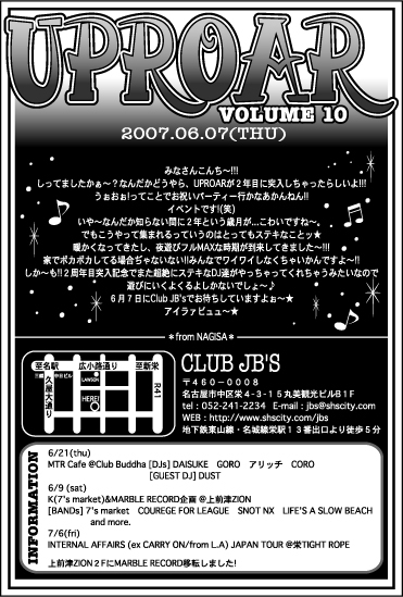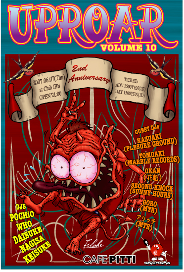 [UPROAR VOLUME 10 〜2nd Anniversary party〜] 6/7(木) @Club JB's OPEN 21:00 Ticket:ADV 1500YEN(2D) DAY 1500YEN(1D) [DJs] POCHiO WHO DAISUKE NAGISA KEISUKE [GUEST DJs] KAZUAKI(PLESURE GROUND) TOMOAKI(MARBLE RECORDS) SECOND KNOCK(SUNNY HOURS) OKAN(花魁) GORO(MTR) アリッチ(MTR) 今回もCAFE PITTIさんのso sweetな皆さんが so sweetなおいしいケーキを出してくれます* きっとステキな夜になると思うのでぜひぜひ遊びに来てください!!
