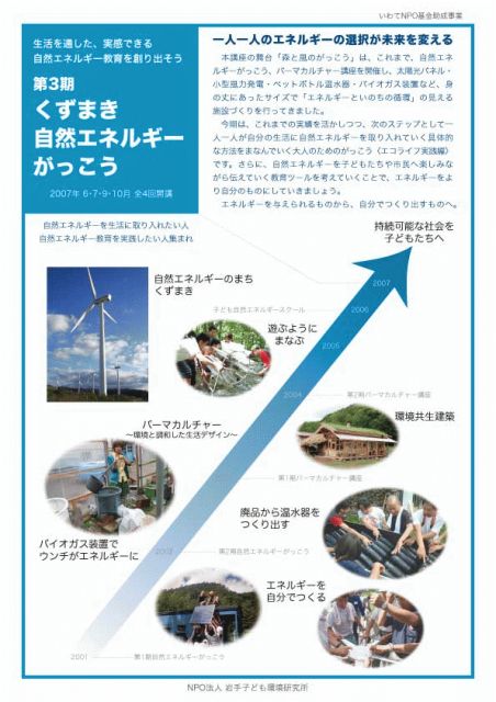 実践的な、自然エネルギーがっこうが始まります。 実際に自然エネルギー取り入れた生活をしたい方、ぜひお越し下さい。 =====(以下、くずまき・自然エネルギーがっこう 案内文)===== いわてNPO基金助成事業 〜生活を通した、実感できる、 自然エネルギー教育を創り出そう〜 ■■ 第3期 くずまき・自然エネルギーがっこう ■■ 2007年 6・7・9・10月 全4回開講 自然エネルギーを生活に取り入れたい人 自然エネルギー教育を実践したい人集まれ 『一人一人のエネルギーの選択が未来を変える』 本講座の舞台