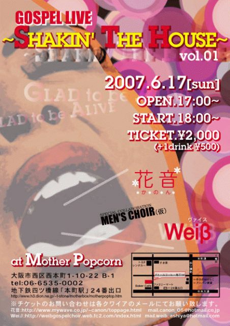 ☆GospelLive 〜SHAKIN' THE HOUSE〜☆ ♪出演 花音/Weiβ +Fluer Blanc(MEN'S CHOIR) ♪Date 6月17日(日) ♪Time Open 17:00 Start 18:00 ♪Ticket ¥2,000(+1drink ¥500) ♪Place Mother Popcorn 大阪市西区西本町1-10-22 B-1 tel:06-6535-0002 地下鉄四ツ橋線「本町駅」24番出口 http://www.h3.dion.ne.jp/~t-stone/motherbox/motherpoptop.htm ♪チケット等のお問い合わせ メッセージか花音HPにてお願い致します。 花音HP http://www.mywave.co.jp/~canon/to
