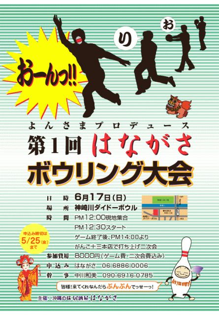 失礼します 告知させてください はながさ、いや十三の名物おじさん「よんさま」プロデュースによる 第1回はながさボウリング大会が開催されます 日時 6/17(日) 場所 神崎川ダイドーボウル 時間 PM12:00現地集合 PM12:30ゲームスタート 終了後、場所を十三がんこ本店に移し打ち上げ二次会となります 会費 8,000円(ゲーム、二次会費ほかすべて込み) 申込み はながさ店頭、電話TEL06-6886-0006にて あるいはわたくしJackまでメールでお申し出ください 締切 5/25(金)まで はながさ馴染みの方だけでなく最近