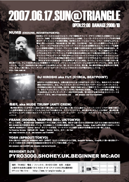 タイムラグなく最先端、世界水準のINDUSTRIAL, FUTURE BEATZを体感できるHYBRID HARDCORE BREAKBEATZ SESSIONS【PRESSURE DROP】。 LIMEWAX来日からはや半年、07.06.17.(SUN)よりPRESSURE DROP 2nd MOVEMENTが始動する。 WELCOME TO THE REAL WORLD...FEEL THE PRESSURE DROP!! みなさんお楽しみに!!!!!! 07.06.17.(SUN) HYBRID HARDCORE BREAKBEATZ SESSIONS 【PRESSURE DROP】 @ TRIANGLE [[CAST]] GUEST LIVE: NUMB (EKOUNE, REVIRTH/TOKYO) NUDE TRUMP aka 裸絵札(ANTI CREW) GUEST DJ: FU1 aka DJ HIR