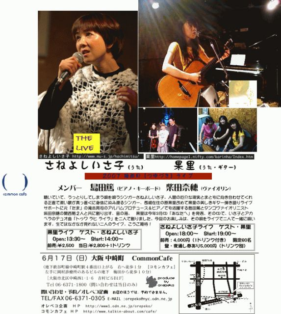 今年もいさ子サンが、東名阪を唄いにいきますよ。みなさん是非お越し下さいね。 なお、予約は各店へ。大阪のみオレペコ企画まで。よろしくお願いします。 さねよしいさ子 2007梅雨月[つゆづき]ツアー メンバー 島田篤(ピアノ・キーボード)柴田奈穂(ヴァイオリン) ゲスト 果里(うた・ギター) 聴いていて、うっとりしてしまう唄を唄うシンガーさねよしいさ子 このメンバーでは2年ぶりの東名阪ツアー決定。 元「たま」の滝本晃司のアルバムプロデュース&ピアノでも活躍する島田篤とタンゴヴァイオリニスト柴田奈穂の関西