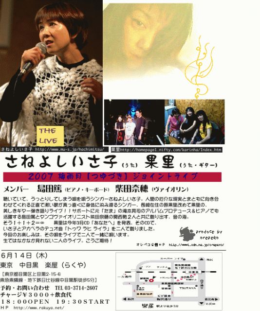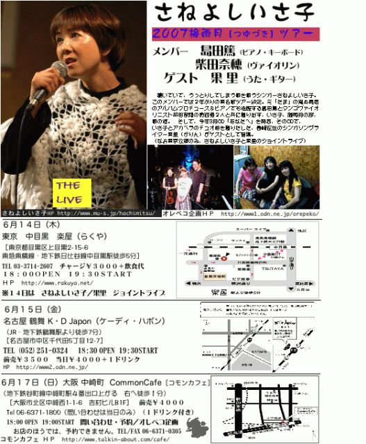 今年もいさ子サンが、東名阪を唄いにいきますよ。みなさん是非お越し下さいね。 なお、予約は各店へ。大阪のみオレペコ企画まで。よろしくお願いします。 さねよしいさ子 2007梅雨月[つゆづき]ツアー メンバー 島田篤(ピアノ・キーボード)柴田奈穂(ヴァイオリン) ゲスト 果里(うた・ギター) 聴いていて、うっとりしてしまう唄を唄うシンガーさねよしいさ子 このメンバーでは2年ぶりの東名阪ツアー決定。 元「たま」の滝本晃司のアルバムプロデュース&ピアノでも活躍する島田篤とタンゴヴァイオリニスト柴田奈穂