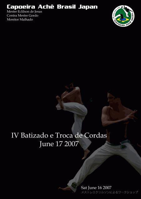 第四回バチザード&トロッカ・ジ・コルダスのお知らせ カナダ、バンクーバーに本部を置くカポエイラ・アシェ・ブラジル大阪支部の Borracha というものです。 カポエイラ・アシェ・ブラジル大阪支部はこの度設立以来お世話になって来たステッピンアウト・スタジオ・ダンサから独立しカポエイラ・アシェ・ブラジル・ジャパンとして本拠地を靱公園内ウツボスタジオに移し再スタートを切りました。日本のカポエイラコミュニティのブラジルよりこられた先生方や日本人として日本のカポエイラをリードしていっている先輩指導者の方々、そして日本全